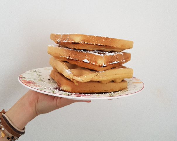 Je vous livre donc ma recette de gaufres sans oeuf absolument délicieuses, accompagnées de photos pas imparfaites. Je me dis qu’une recette floue est mieux que pas de recette du tout! Et elle est siiiii bonne que je ne peux PAS la garder dans ma tête!